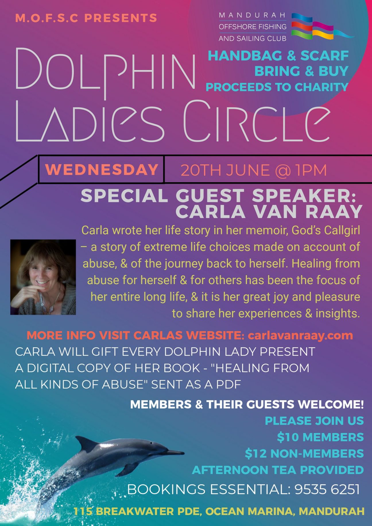 Dolphin Ladies Circle Special Guest – Carla Van Raay Handbag & Scarf Bring & Buy (proceeds to charity) Wednesday 20th June – 1pm Carla wrote her life story in her … Read More
